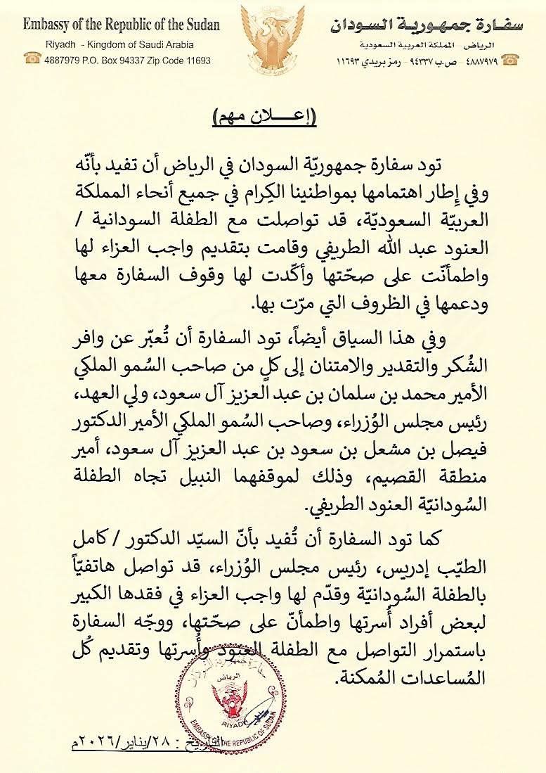 واختتمت السفارة بيانها بالتأكيد على استمرار جهودها في متابعة أوضاع المواطنين السودانيين بالمملكة العربية السعودية، مجددة التزامها بالقيام بدورها الإنساني والوطني، والدعاء للطفلة العنود الطريفي بالشفاء والصبر، ولأسرتها بمزيد من السكينة والثبات.