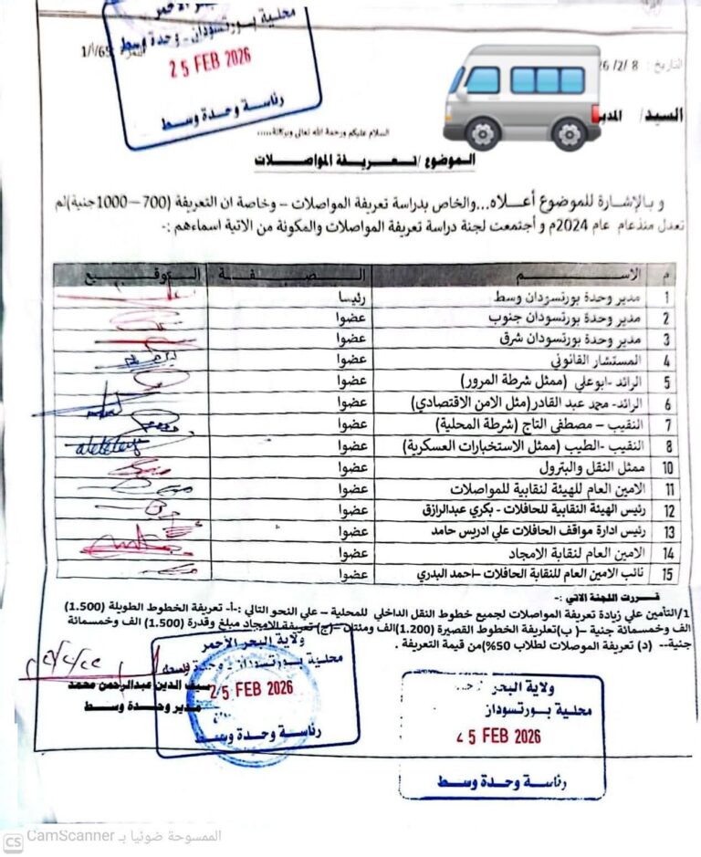 متابعات_موجز، السودان الان ـ أقرت لجنة دراسة تعرفة المواصلات بمحلية بورتسودان زيادة جديدة في أسعار تذاكر النقل الداخلي لجميع الخطوط، وذلك عقب اجتماع خُصص لمراجعة التعرفة في ظل المتغيرات الاقتصادية الراهنة.